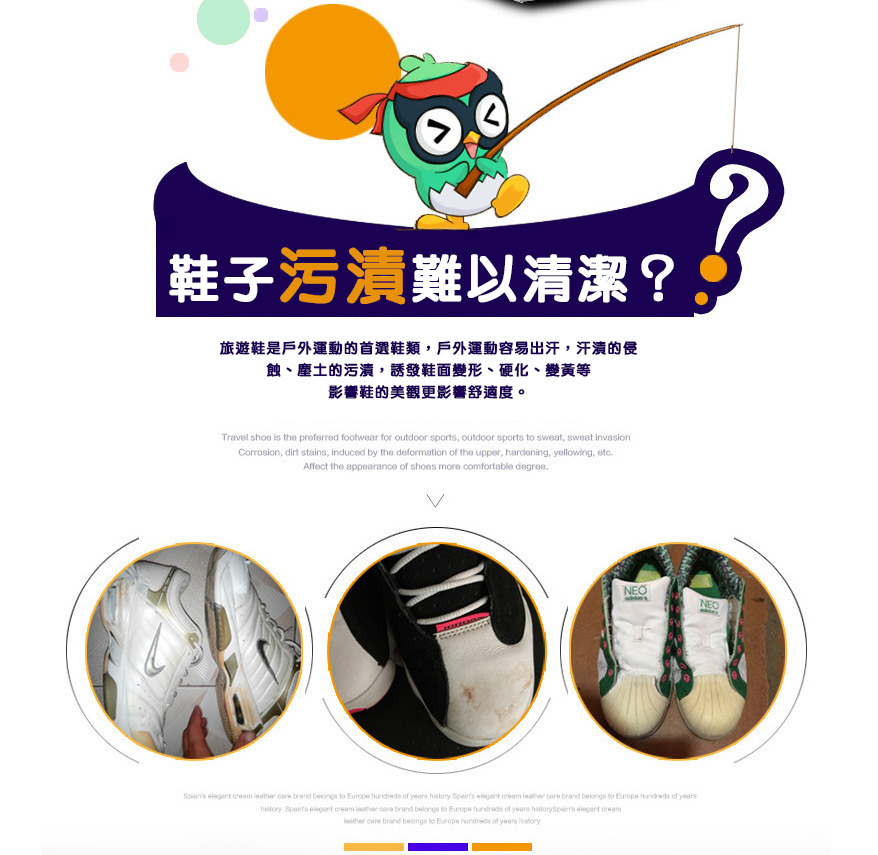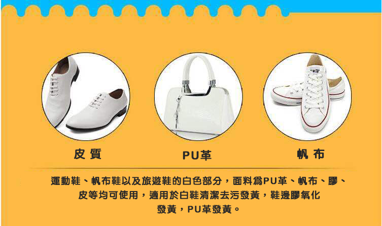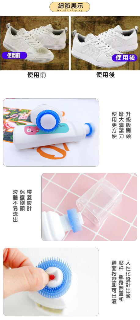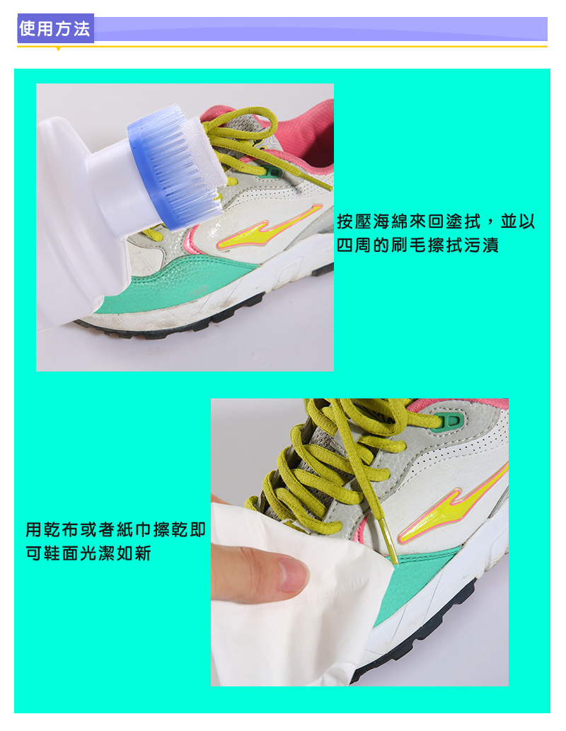 ●獨特的活性劑和增白酶配製而成,快速清除運動鞋、波鞋、旅遊鞋、布鞋上的污漬